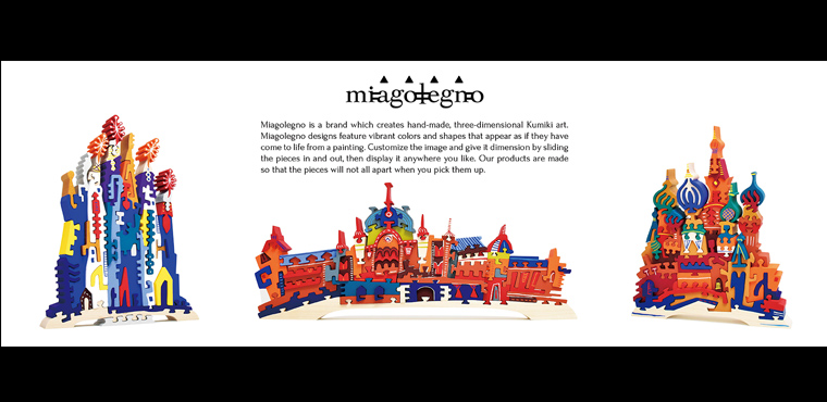 Miagolegno is a brand which creates hand-made, three-dimensional Kumiki art. Miagolegno designs feature vibrant colors and shapes that appear as if they have come to life from a painting. Customize the image and give it dimension by sliding the pieces in and out, then display it anywhere you like. Our products_1 are made so that the pieces will not fall apart whee you pick them up.